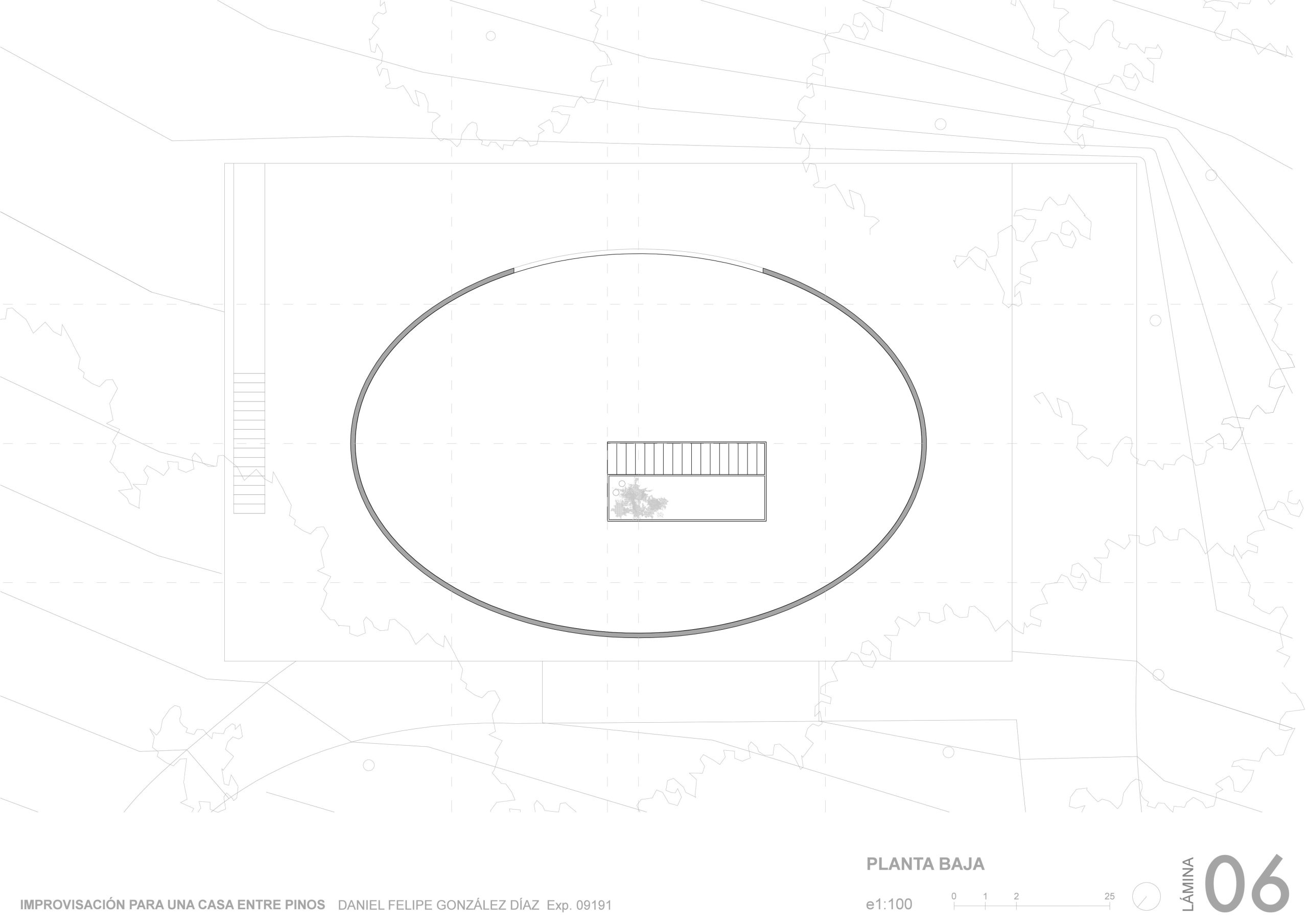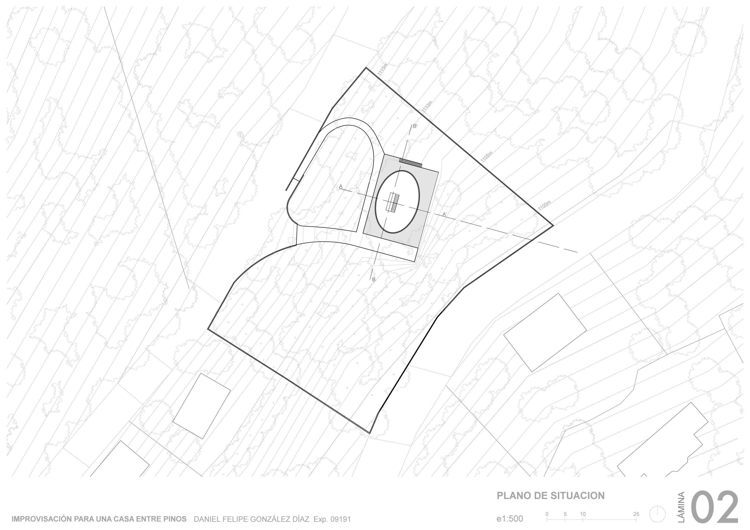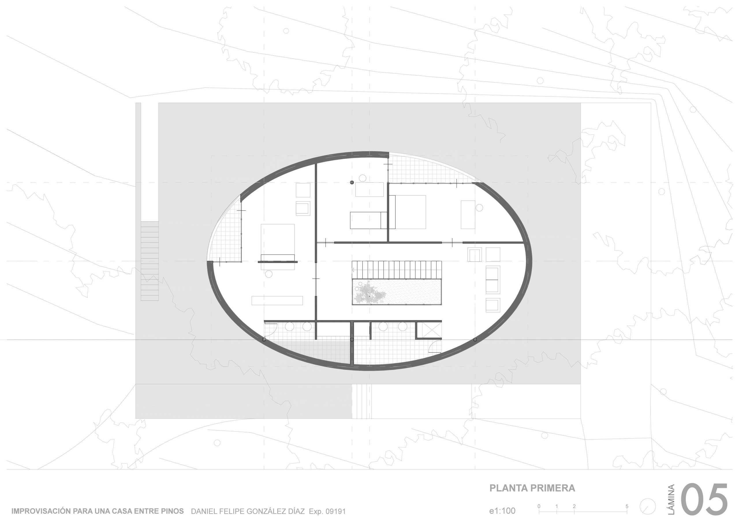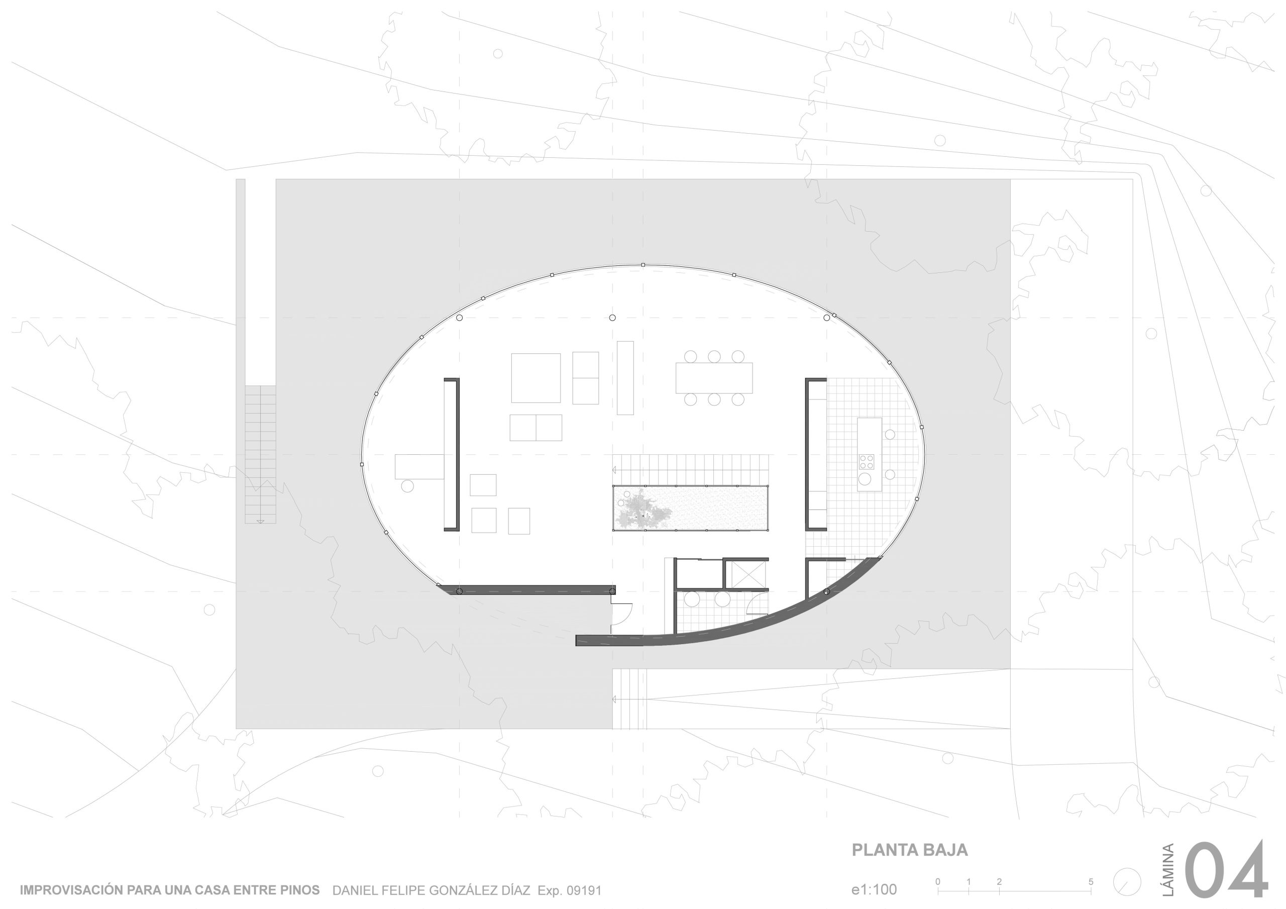 El proyecto consiste en un ejercicio de geometría, encajar el programa de necesidades de una vivienda unifamiliar en un edificio de dos plantas de forma elíptica, en una ubicación emblemática con vistas al Palacio del Escorial, en ladera y rodeada de pinos.