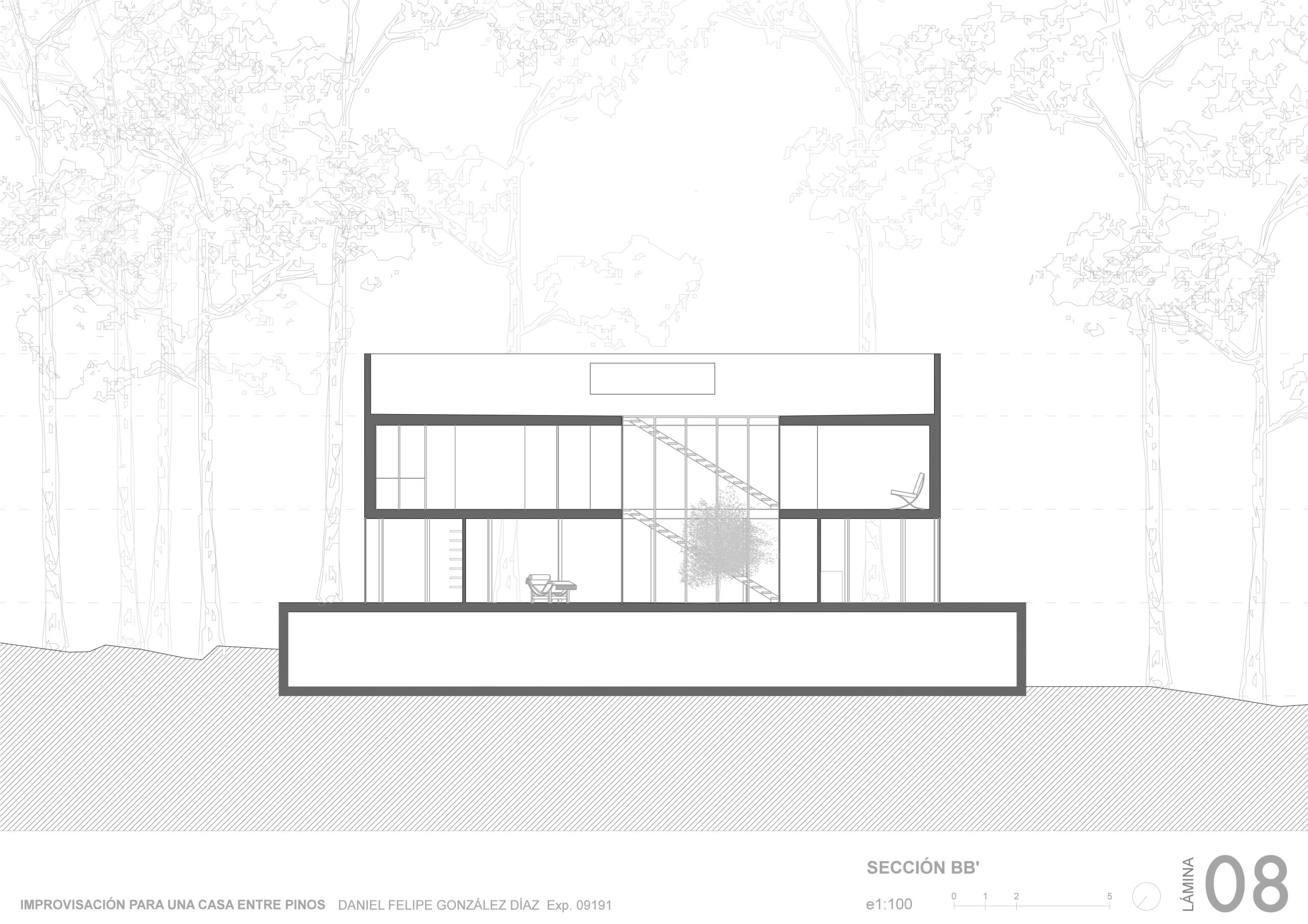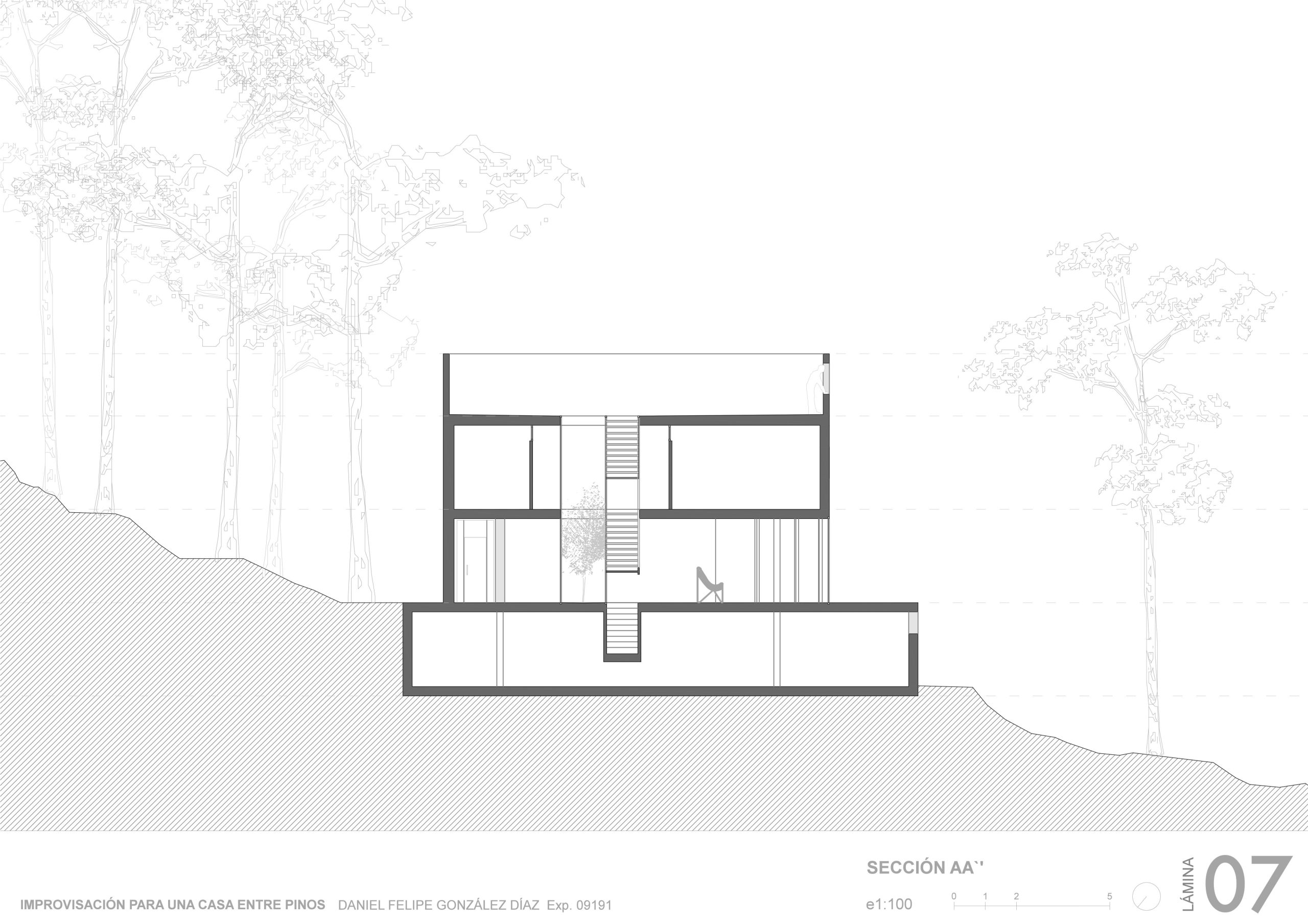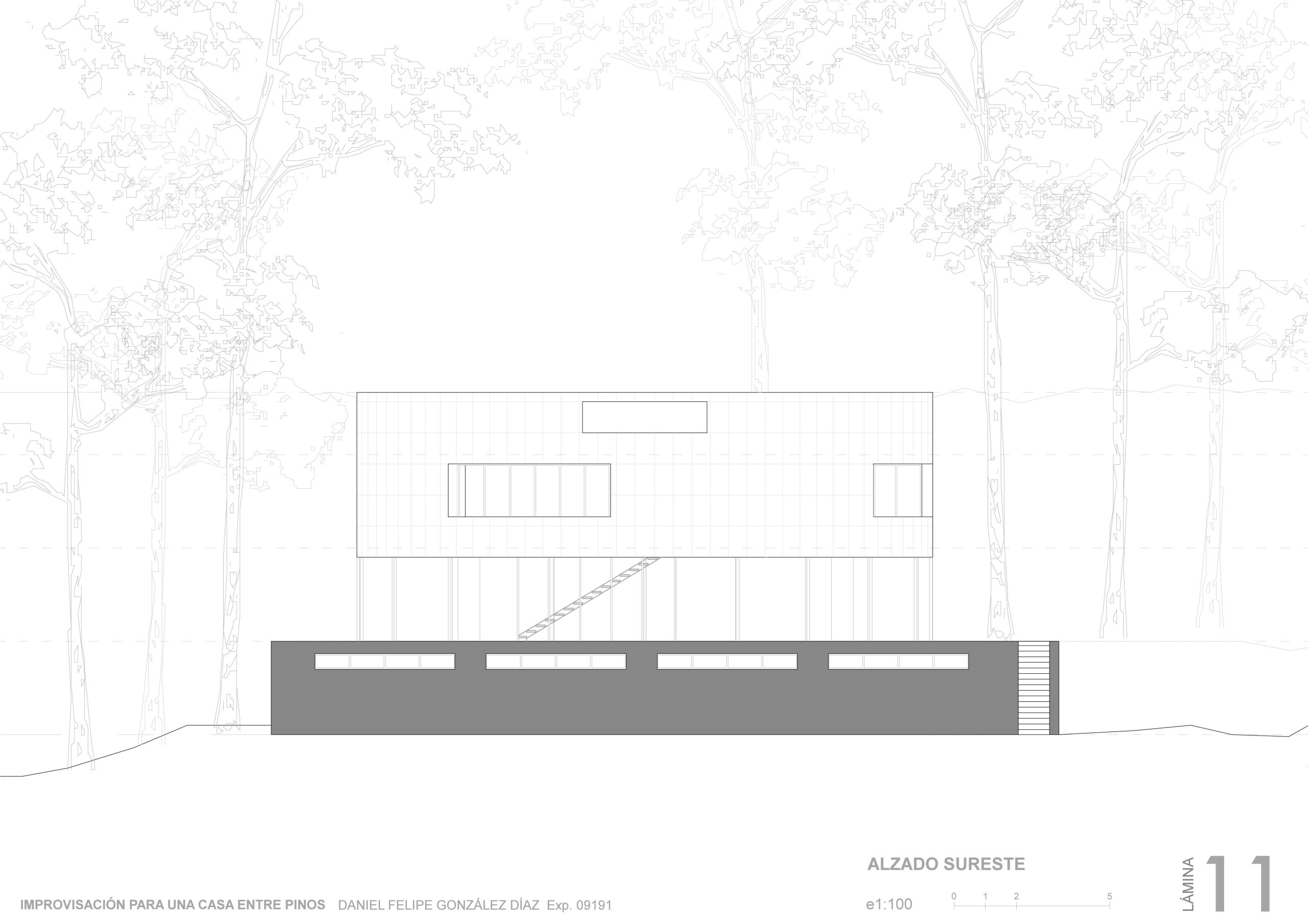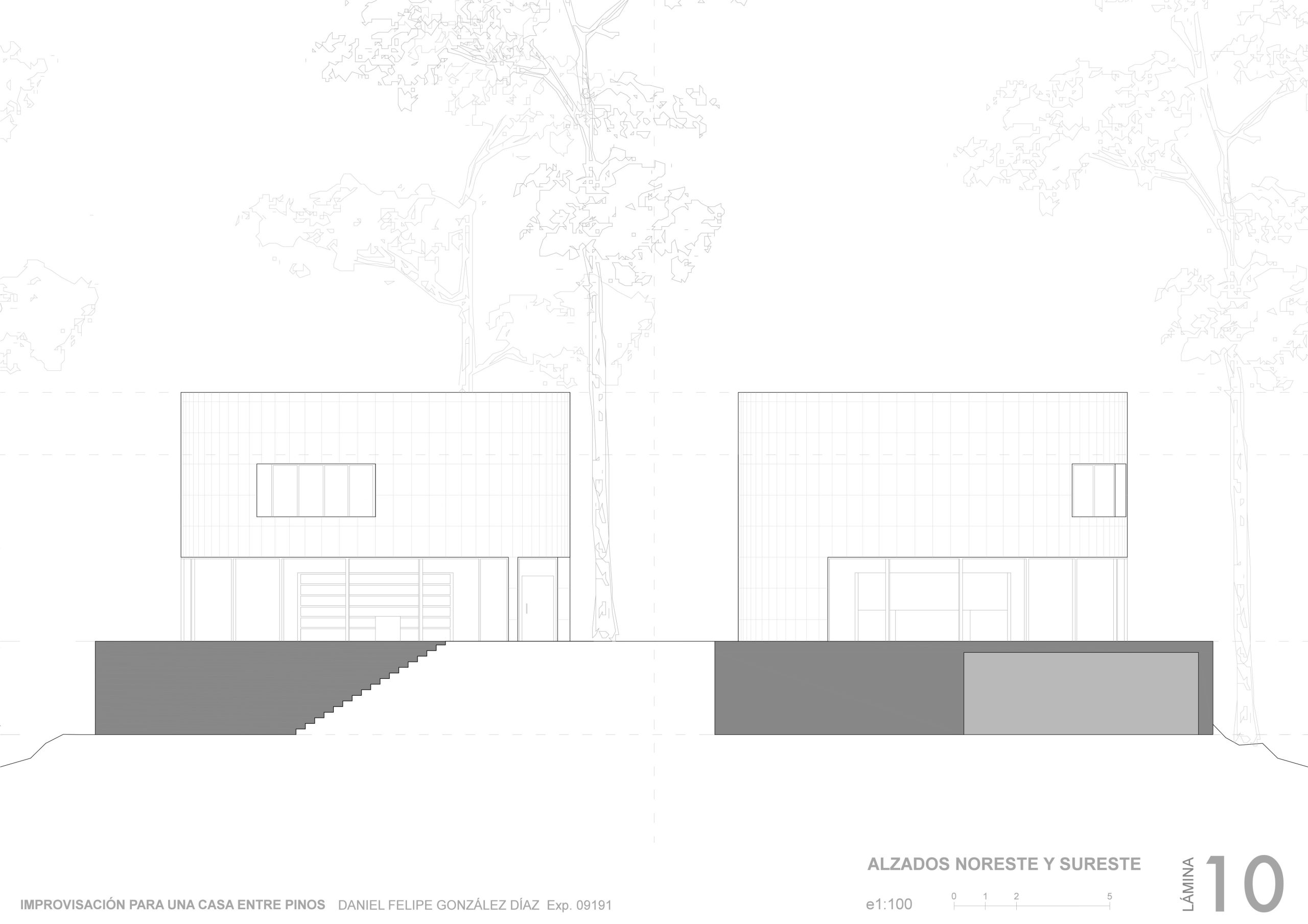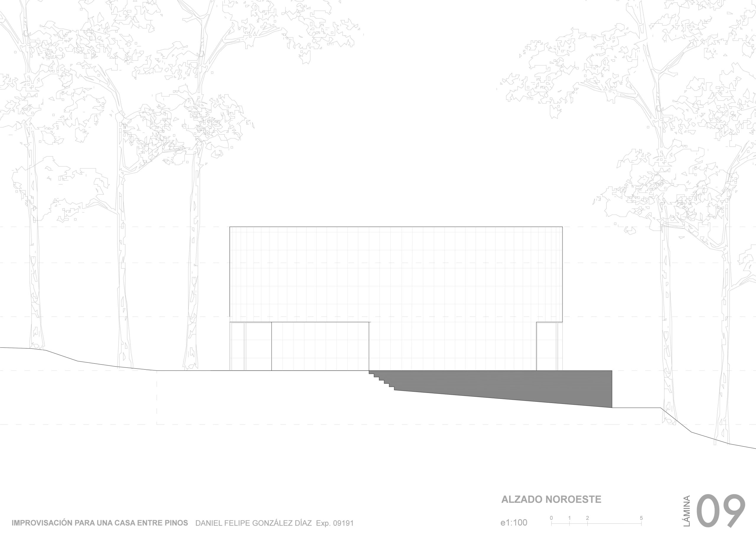El proyecto consiste en un ejercicio de geometría, encajar el programa de necesidades de una vivienda unifamiliar en un edificio de dos plantas de forma elíptica, en una ubicación emblemática con vistas al Palacio del Escorial, en ladera y rodeada de pinos.