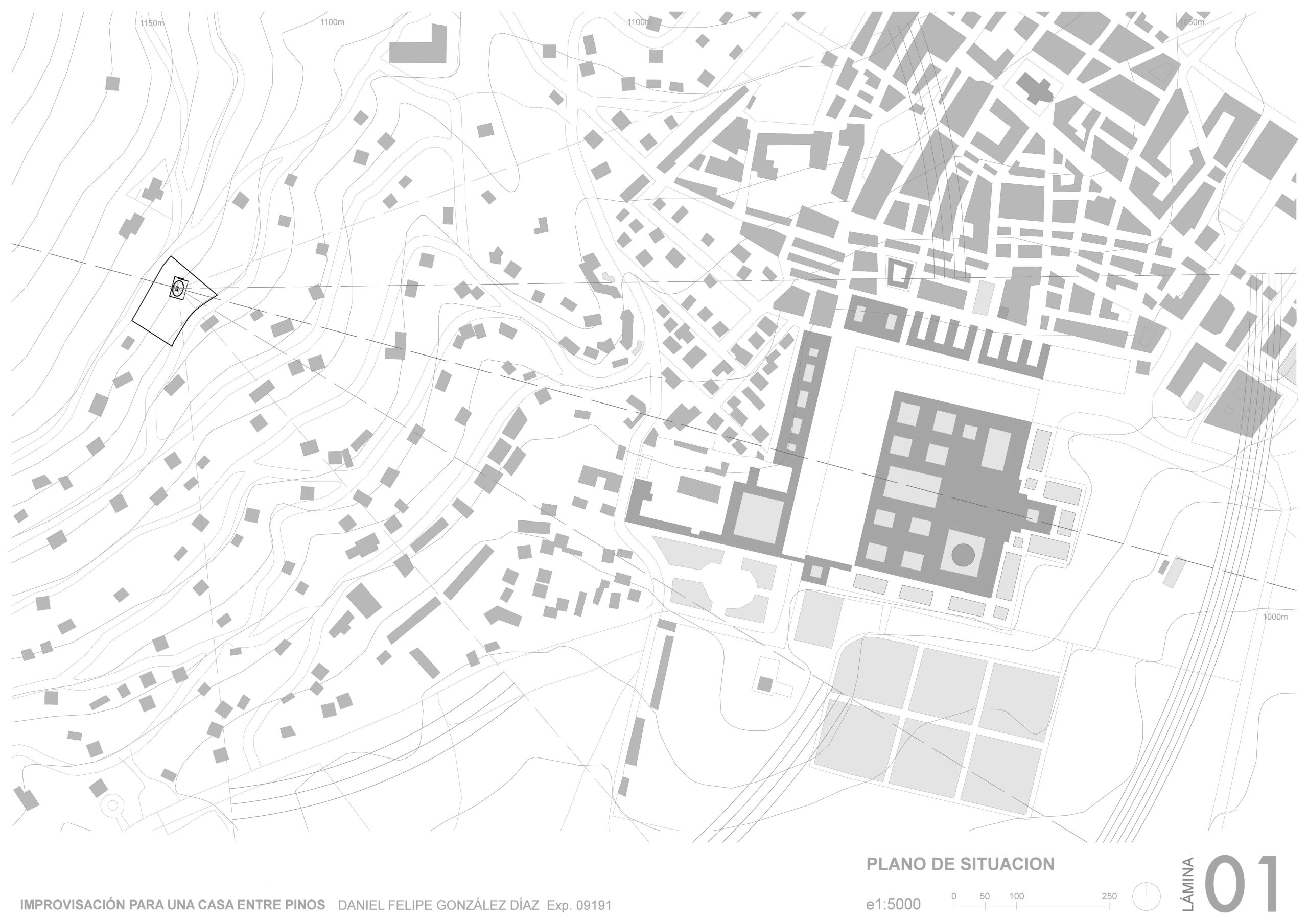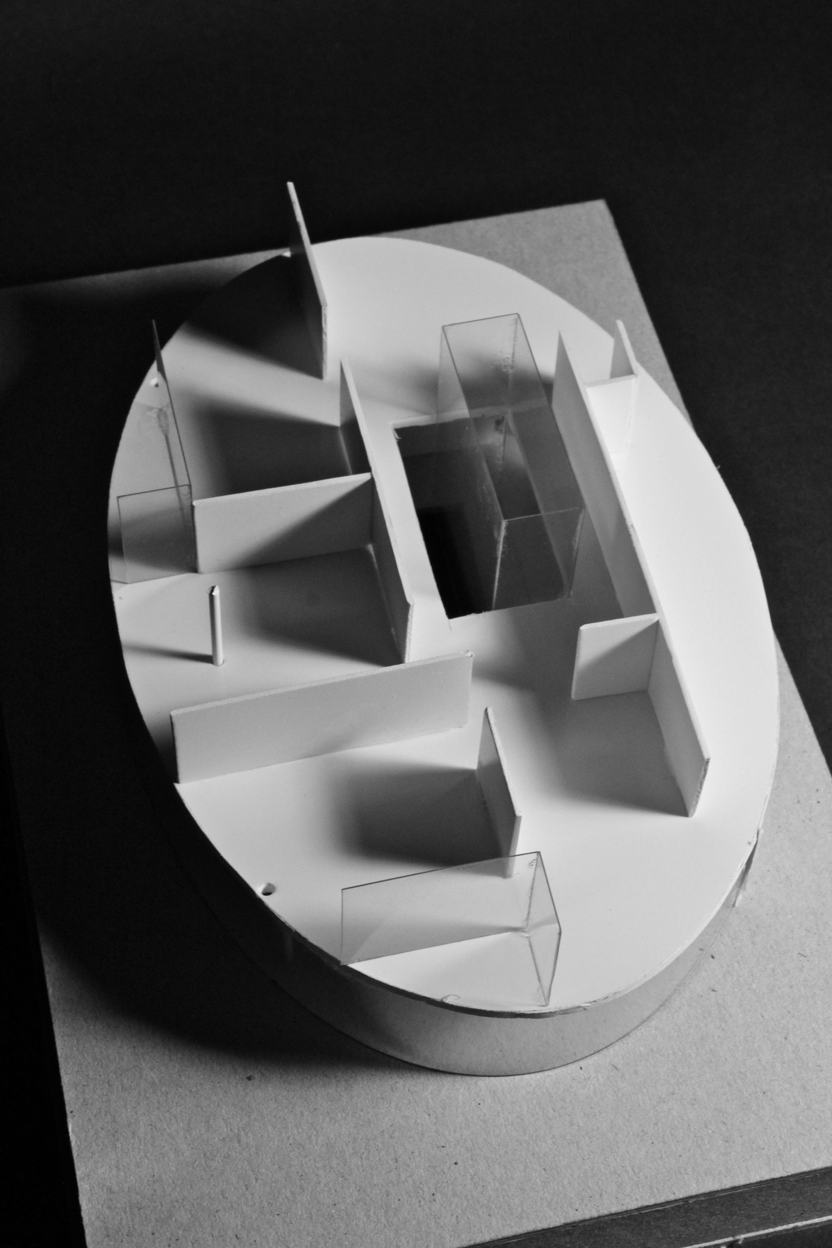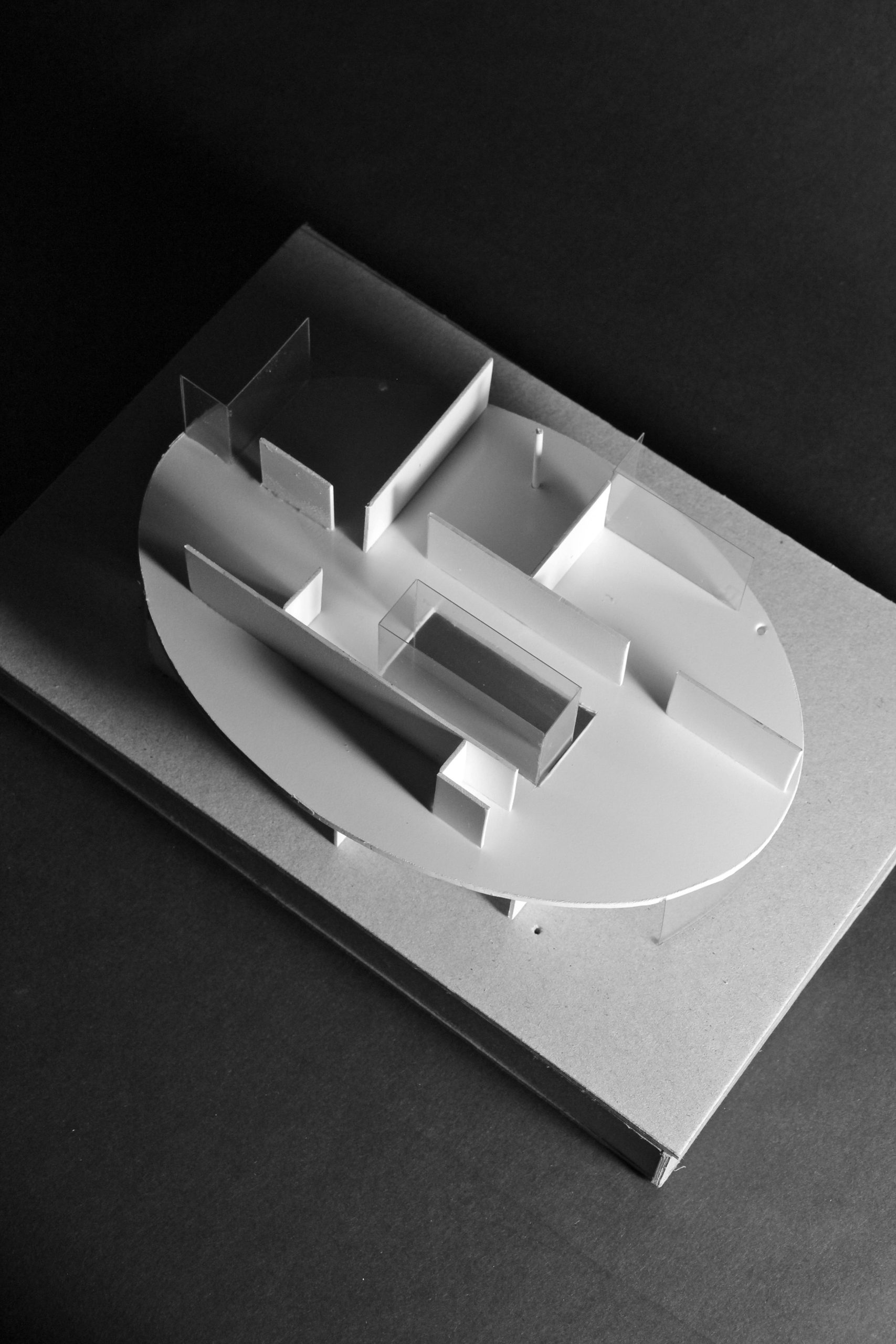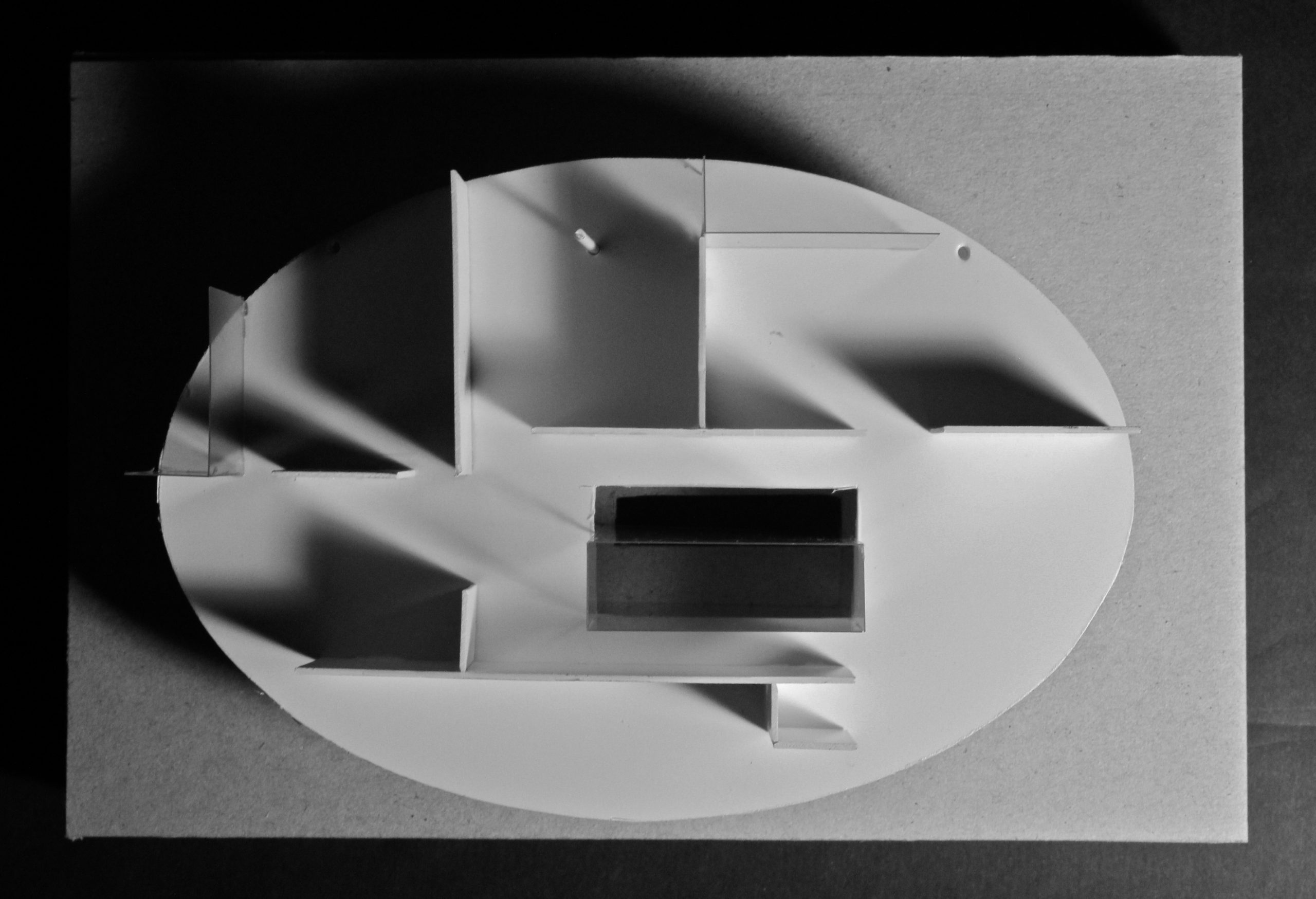 El proyecto consiste en un ejercicio de geometría, encajar el programa de necesidades de una vivienda unifamiliar en un edificio de dos plantas de forma elíptica, en una ubicación emblemática con vistas al Palacio del Escorial, en ladera y rodeada de pinos.