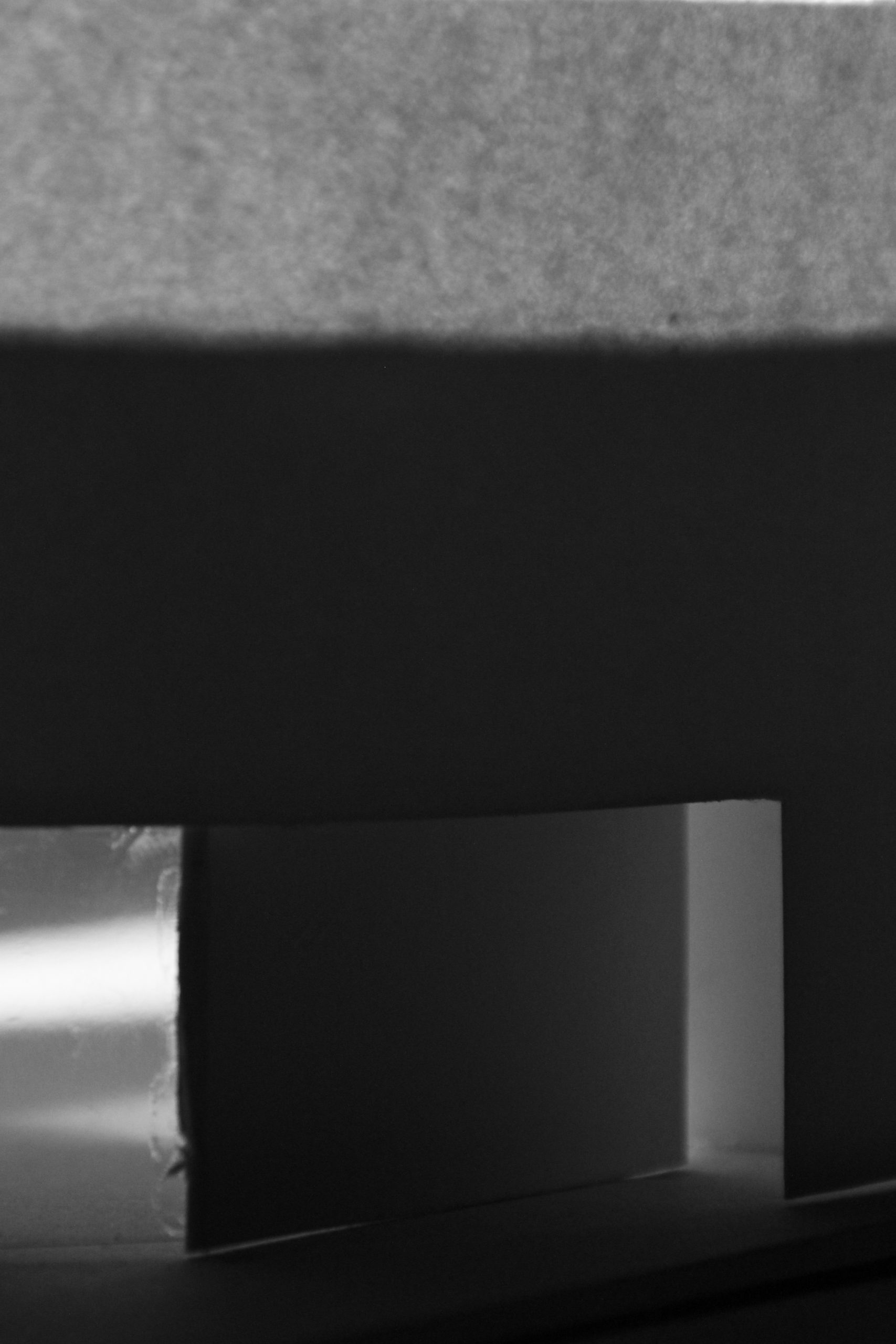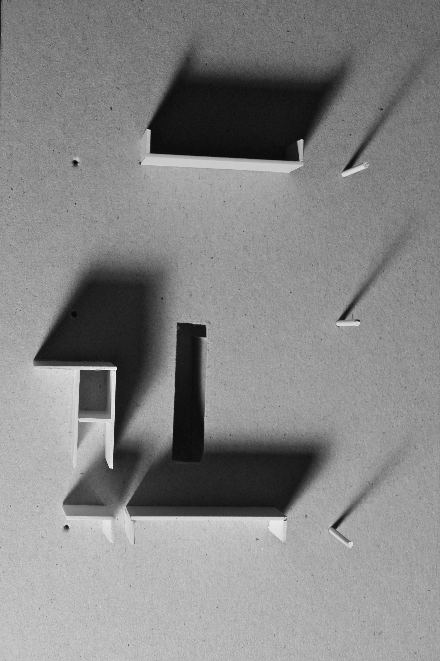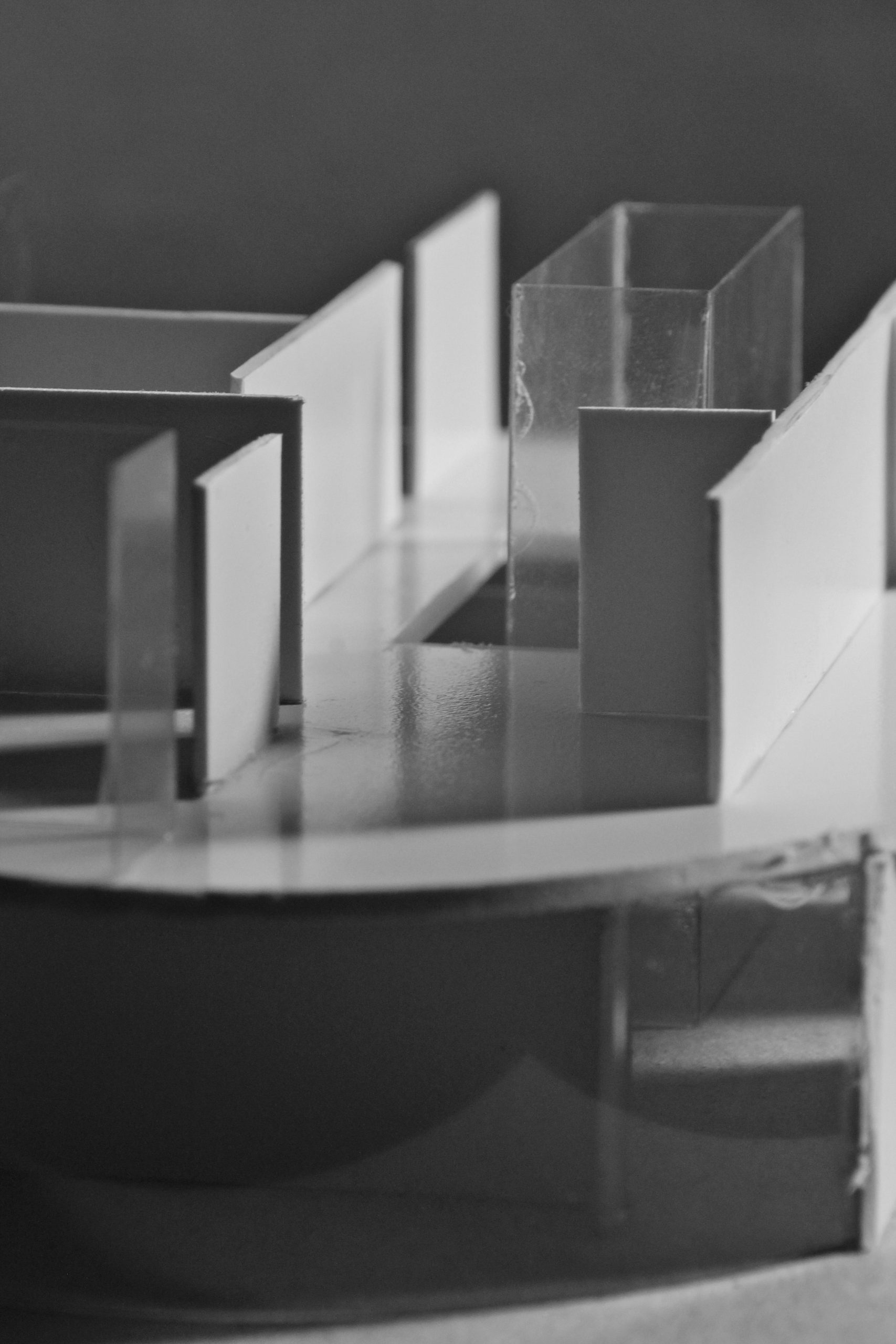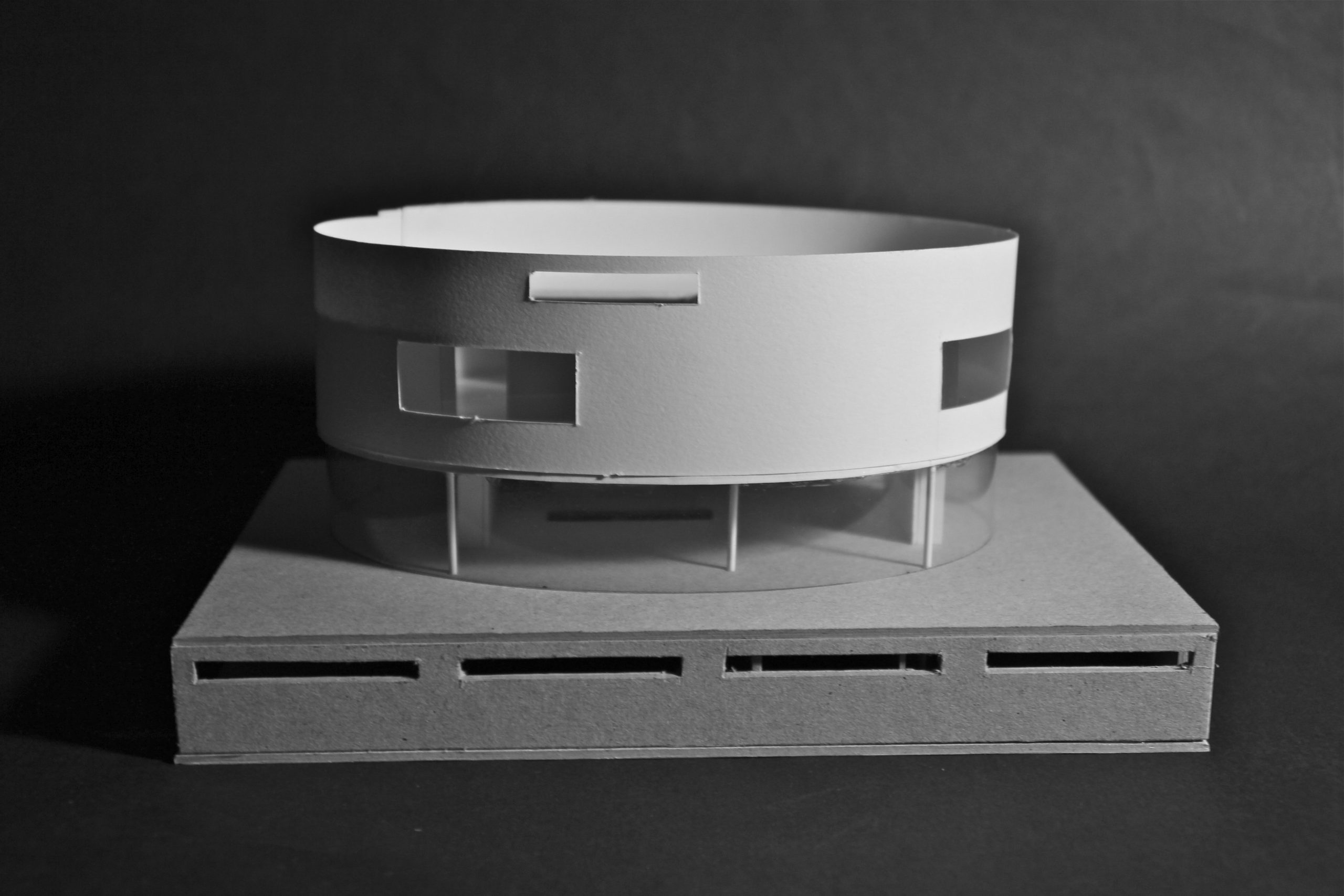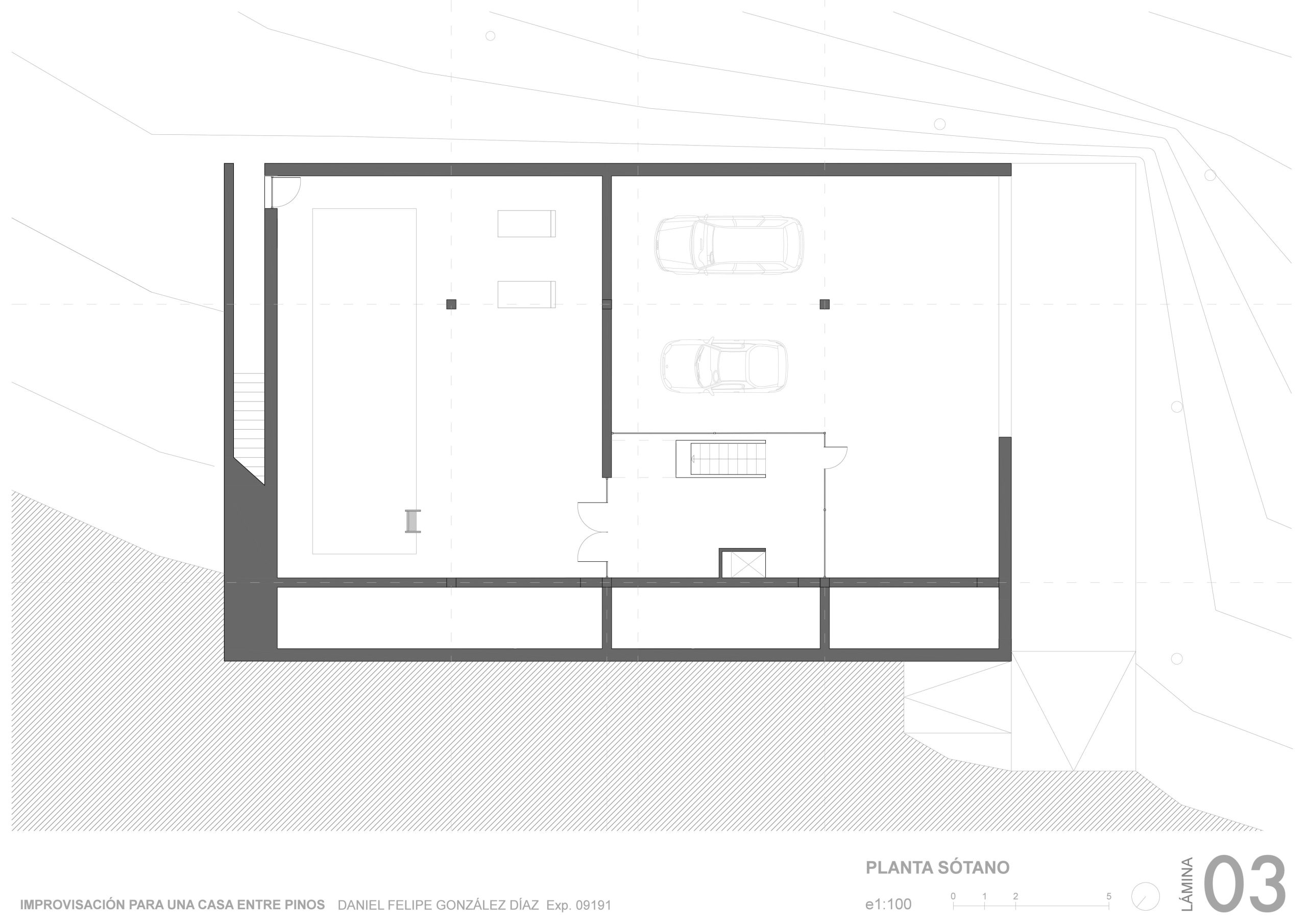 Un gran basamento recto de hormigón resuelve la topografía creando una base sobre la que se asienta y se distribuye el programa de aparcamiento y piscina interior. Este proyecto fue realizado con los arquitectos de José de Andrés Moncayo y Rodrigo Alarcón Ayllo.