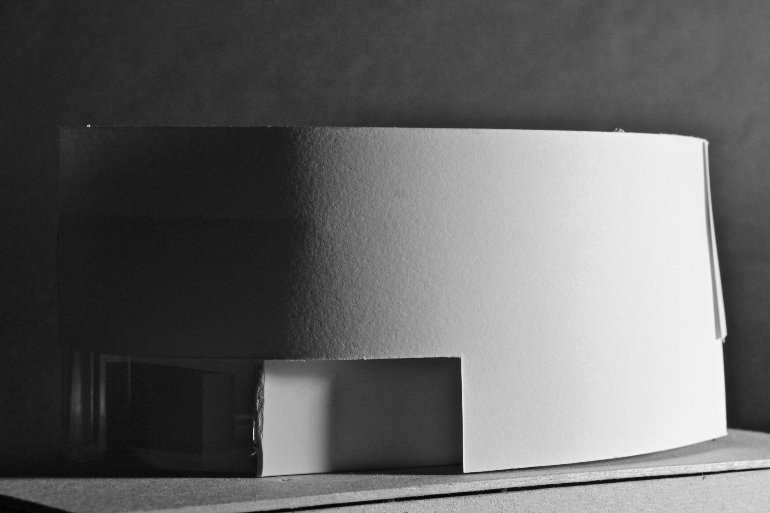 Partiendo de un cilindro de base elíptica, las fachadas se van horadando y creando las terrazas. Se decide la materialidad de las fachadas, se opta por hacer una planta baja diáfana, con fachada de vidrio, lo más transparente posible para aprovechar las vistas al Monasterio de San Lorenzo de El Escorial. En la planta alta, donde se ubican las habitaciones, se acomenten mordidas donde situar los vidrios, y finalmente en la planta de cubiertas se abre un gran marco orientado, encuadrando las vistas.